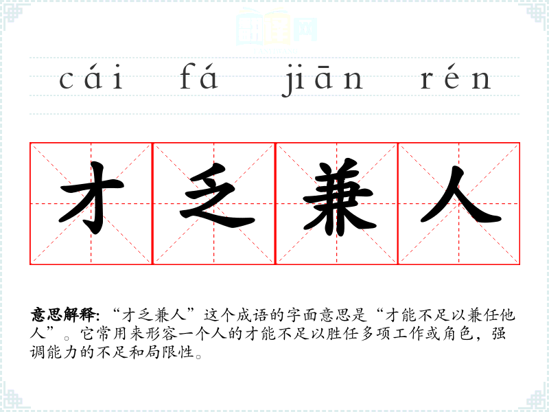 “才乏兼人”这个成语的字面意思是“才能不足以兼任他人”。它常用来形容一个人的才能不足以胜任多项工作或角色,强调能力的不足和局限性。