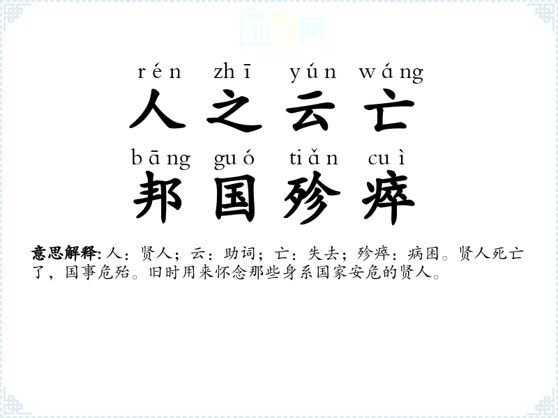 人:贤人;云:助词;亡:失去;殄瘁:病困。贤人死亡了,国事危殆。旧时用来怀念那些身系国家安危的贤人。 |