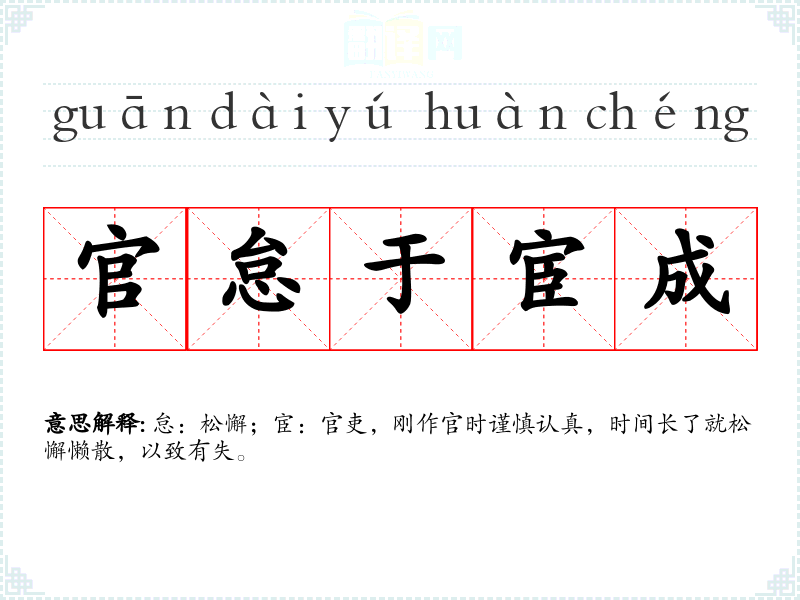 | 官怠于宦成 | 怠:松懈;宦:官吏,刚作官时谨慎认真,时间长了就松懈懒散,以致有失。 |