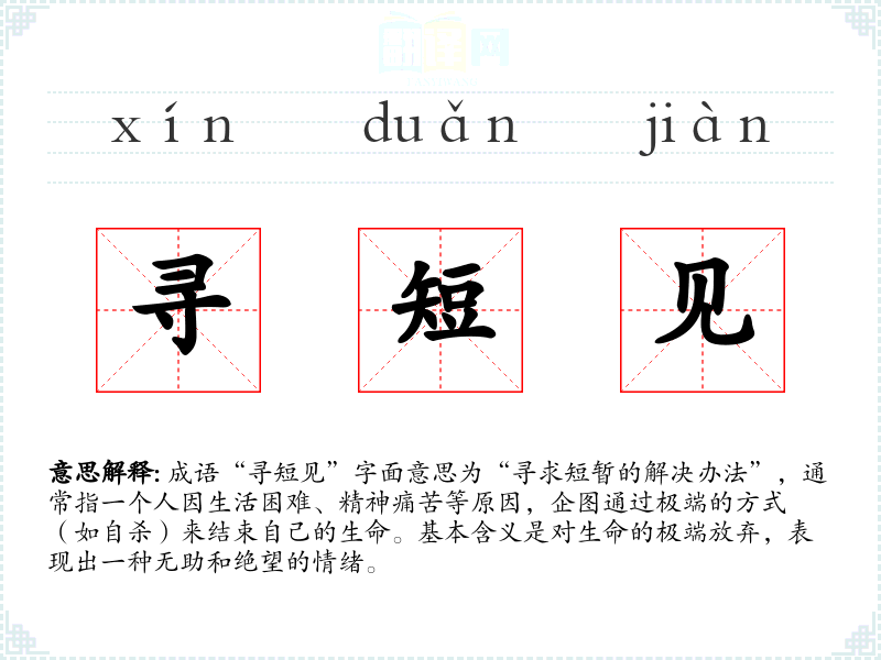 成语“寻短见”字面意思为“寻求短暂的解决办法”,通常指一个人因生活困难、精神痛苦等原因,企图通过极端的方式(如自杀)来结束自己的生命。基本含义是对生命的极端放弃,表现出一种无助和绝望的情绪。