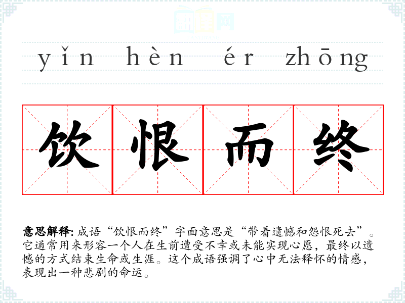 成语“饮恨而终”字面意思是“带着遗憾和怨恨死去”。它通常用来形容一个人在生前遭受不幸或未能实现心愿,最终以遗憾的方式结束生命或生涯。这个成语强调了心中无法释怀的情感,表现出一种悲剧的命运。