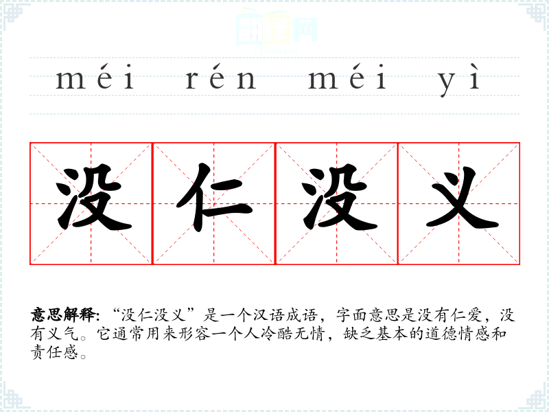 “没仁没义”是一个汉语成语,字面意思是没有仁爱,没有义气。它通常用来形容一个人冷酷无情,缺乏基本的道德情感和责任感。