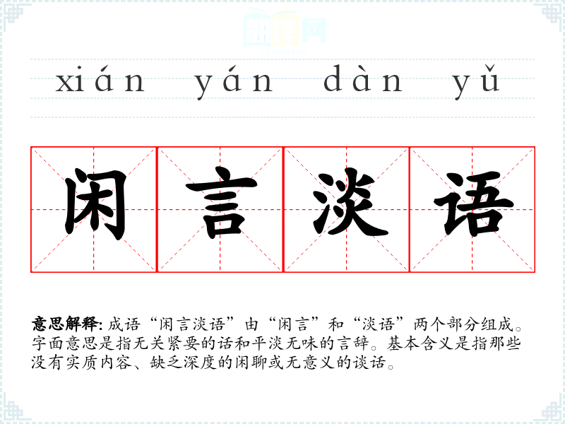 成语“闲言淡语”由“闲言”和“淡语”两个部分组成。字面意思是指无关紧要的话和平淡无味的言辞。基本含义是指那些没有实质内容、缺乏深度的闲聊或无意义的谈话。