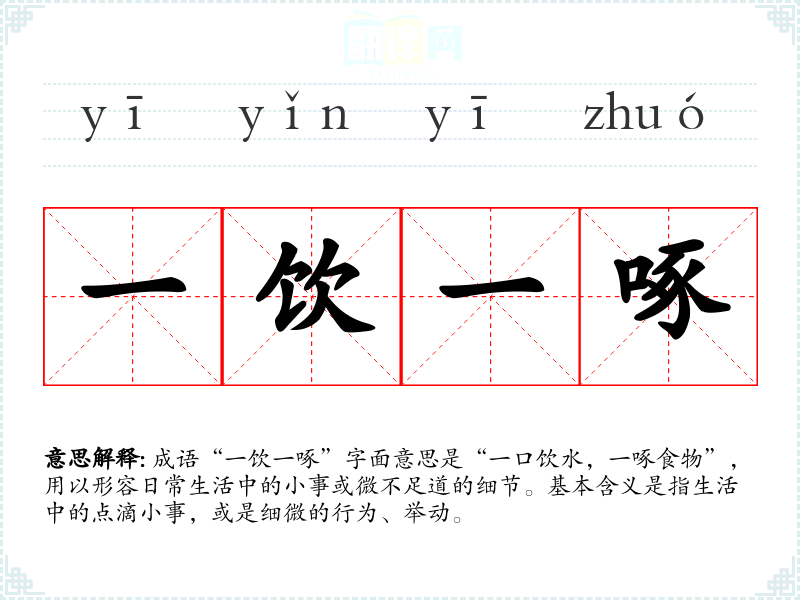 成语“一饮一啄”字面意思是“一口饮水,一啄食物”,用以形容日常生活中的小事或微不足道的细节。基本含义是指生活中的点滴小事,或是细微的行为、举动。