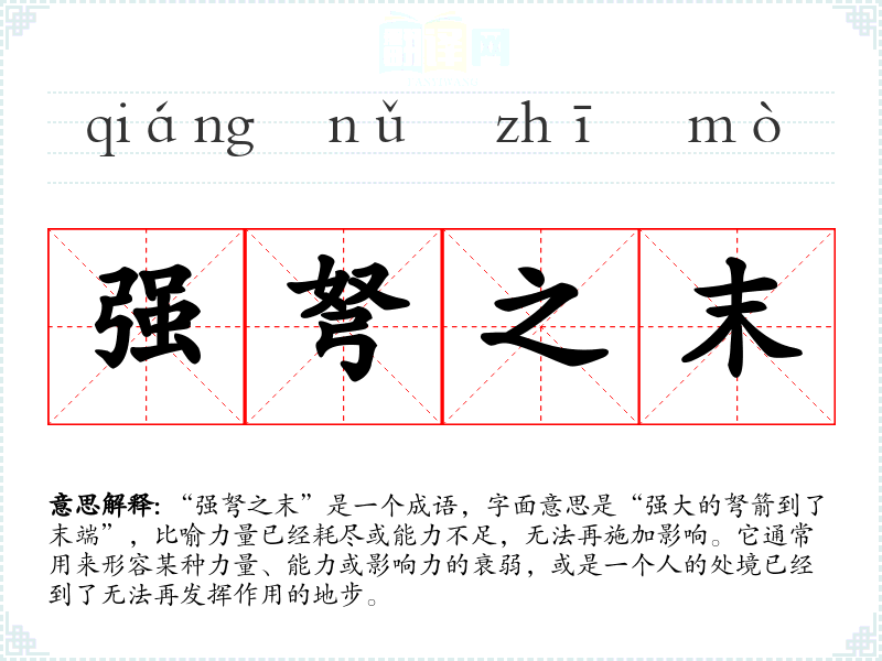 “强弩之末”是一个成语,字面意思是“强大的弩箭到了末端”,比喻力量已经耗尽或能力不足,无法再施加影响。它通常用来形容某种力量、能力或影响力的衰弱,或是一个人的处境已经到了无法再发挥作用的地步。