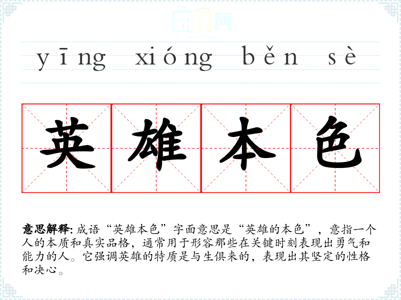 成语“英雄本色”字面意思是“英雄的本色”,意指一个人的本质和真实品格,通常用于形容那些在关键时刻表现出勇气和能力的人。它强调英雄的特质是与生俱来的,表现出其坚定的性格和决心。