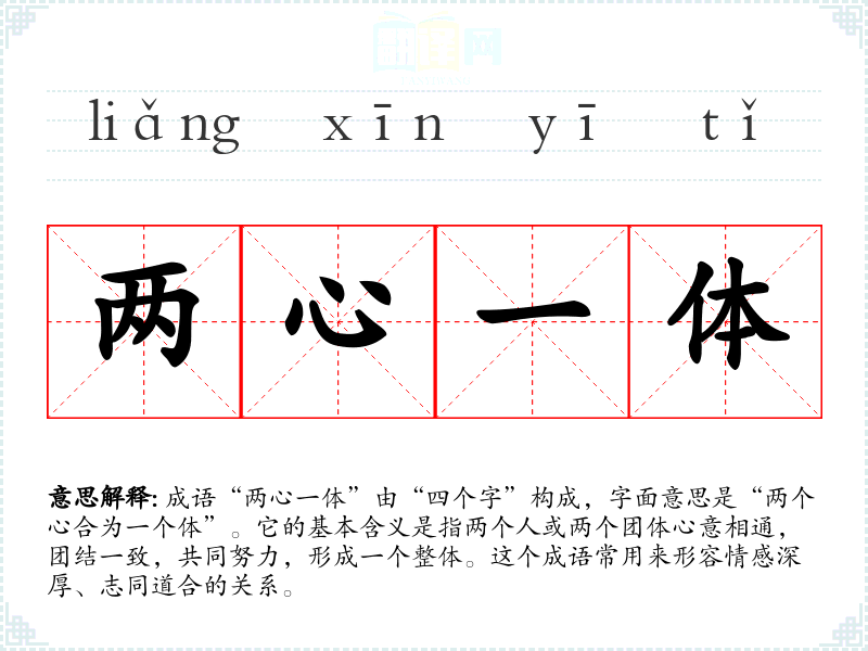 成语“两心一体”由“四个字”构成,字面意思是“两个心合为一个体”。它的基本含义是指两个人或两个团体心意相通,团结一致,共同努力,形成一个整体。这个成语常用来形容情感深厚、志同道合的关系。