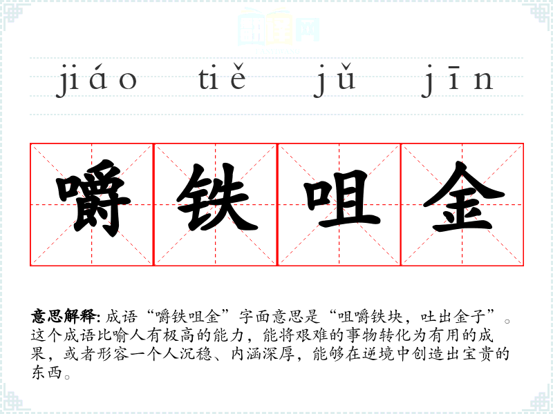 成语“嚼铁咀金”字面意思是“咀嚼铁块,吐出金子”。这个成语比喻人有极高的能力,能将艰难的事物转化为有用的成果,或者形容一个人沉稳、内涵深厚,能够在逆境中创造出宝贵的东西。