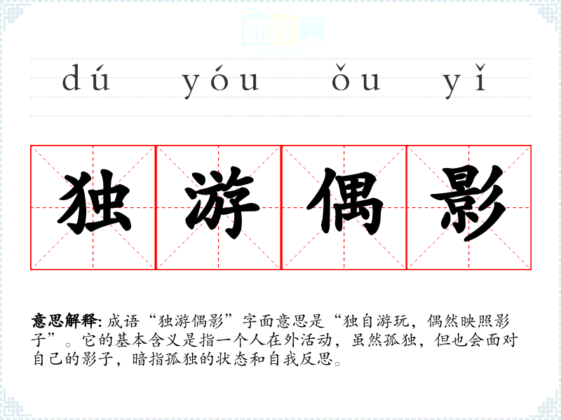 成语“独游偶影”字面意思是“独自游玩,偶然映照影子”。它的基本含义是指一个人在外活动,虽然孤独,但也会面对自己的影子,暗指孤独的状态和自我反思。