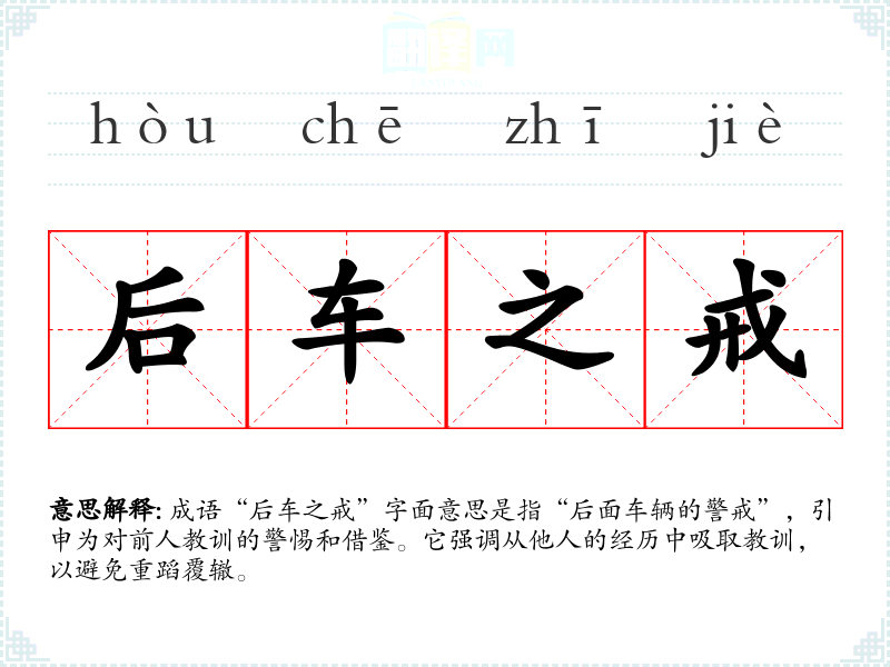 | 后车之戒 | 对后面跟上来的车子的警戒。比喻以前的失败或挫折,可以作为以后做事情的借鉴或教训。 |