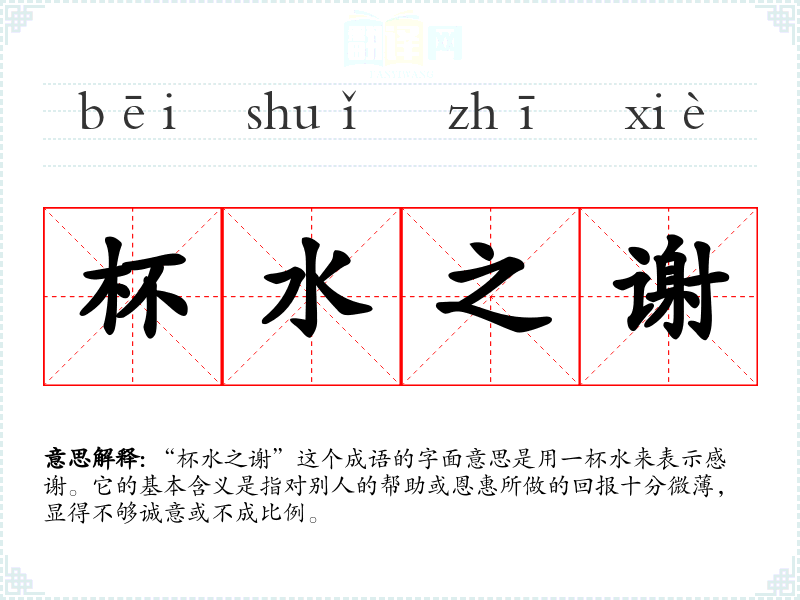 “杯水之谢”这个成语的字面意思是用一杯水来表示感谢。它的基本含义是指对别人的帮助或恩惠所做的回报十分微*,显得不够诚意或不成比例。