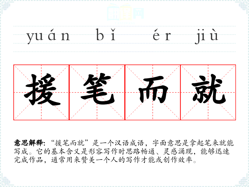 “援笔而就”是一个汉语成语,字面意思是拿起笔来就能写成。它的基本含义是形容写作时思路畅通、灵感涌现,能够迅速完成作品,通常用来赞美一个人的写作才能或创作效率。
