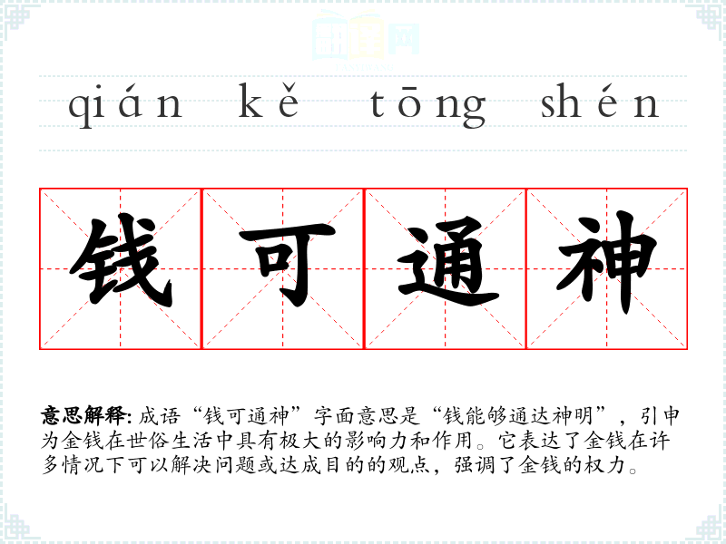 成语“钱可通神”字面意思是“钱能够通达神明”,引申为金钱在世俗生活中具有极大的影响力和作用。它表达了金钱在许多情况下可以解决问题或达成目的的观点,强调了金钱的权力。