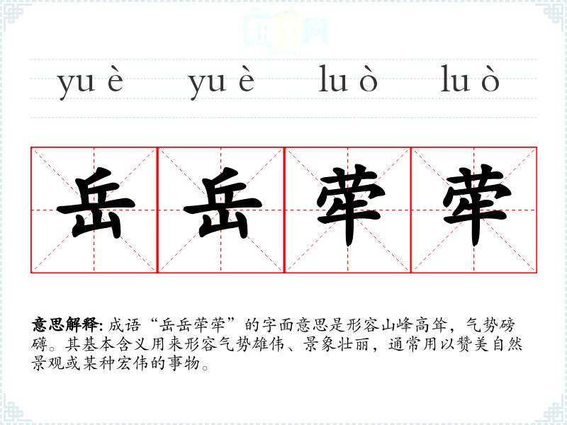 “岳岳荦荦”出自《诗经·小雅·天保》,其中有“岳岳荦荦,岿岿然其高”。这里的“岳”指高山,“荦荦”则指层峦叠嶂,形容山的高耸和壮丽。它在古代文献中多用于描绘自然景观,展现大自然的雄伟与壮观。