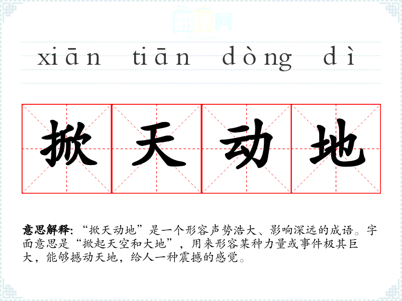 - 同义成语:震天动地、声势浩大、翻天覆地。这些成语都强调某种力量或**的巨大影响。