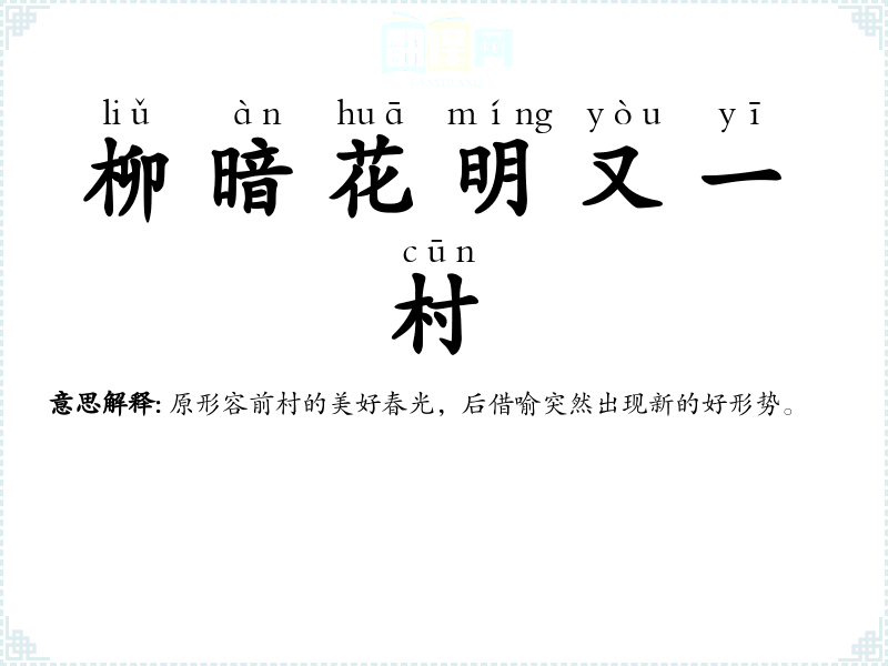 | 柳暗花明又一村 | 原形容前村的美好春光,后借喻突然出现新的好形势。 |