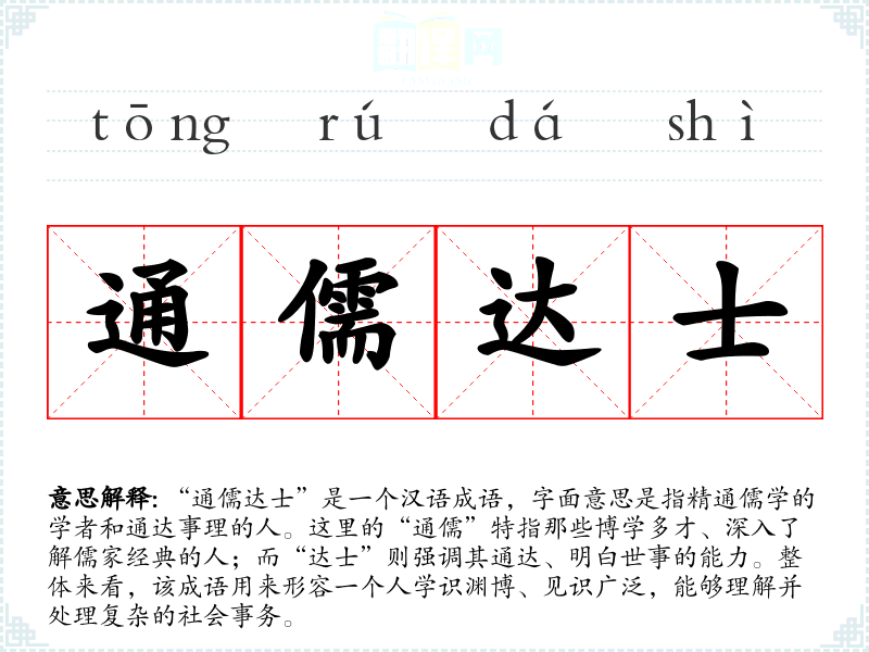 “通儒达士”是一个汉语成语,字面意思是指精通儒学的学者和通达事理的人。这里的“通儒”特指那些博学多才、深入了解儒家经典的人;而“达士”则强调其通达、明白世事的能力。整体来看,该成语用来形容一个人学识渊博、见识广泛,能够理解并处理复杂的社会事务。