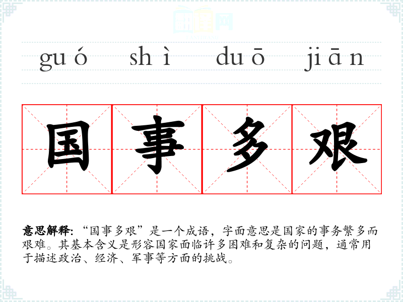 “国事多艰”是一个成语,字面意思是国家的事务繁多而艰难。其基本含义是形容国家面临许多困难和复杂的问题,通常用于描述政治、经济、军事等方面的挑战。