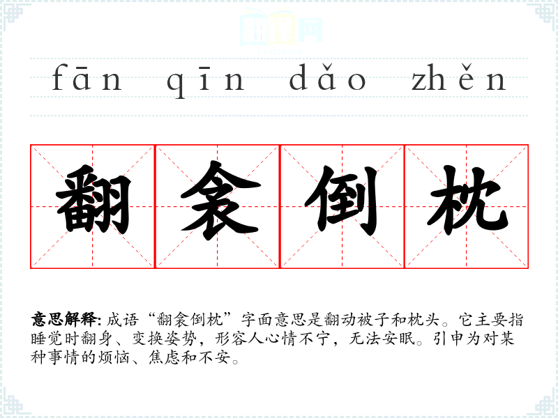 成语“翻衾倒枕”字面意思是翻动被子和枕头。它主要指睡觉时翻身、变换姿势,形容人心情不宁,无法安眠。引申为对某种事情的烦恼、焦虑和不安。
