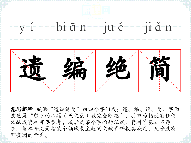 成语“遗编绝简”由四个字组成:遗、编、绝、简。字面意思是“留下的书籍(或文稿)被完全断绝”,引申为指没有任何文献或资料可供参考,或者是某个事物的记载、资料等基本不存在。基本含义是指某个领域或主题的文献资料极其缺乏,几乎没有可查阅的资料。
