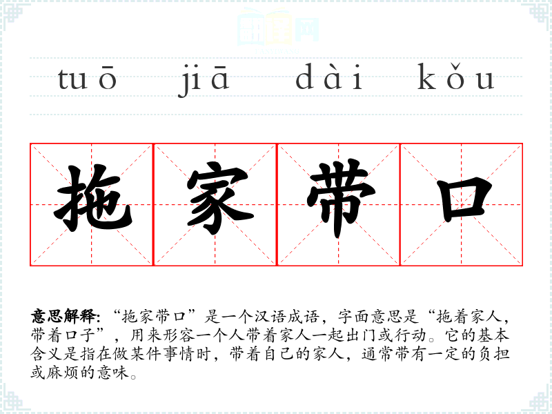 “拖家带口”是一个汉语成语,字面意思是“拖着家人,带着口子”,用来形容一个人带着家人一起出门或行动。它的基本含义是指在做某件事情时,带着自己的家人,通常带有一定的负担或麻烦的意味。