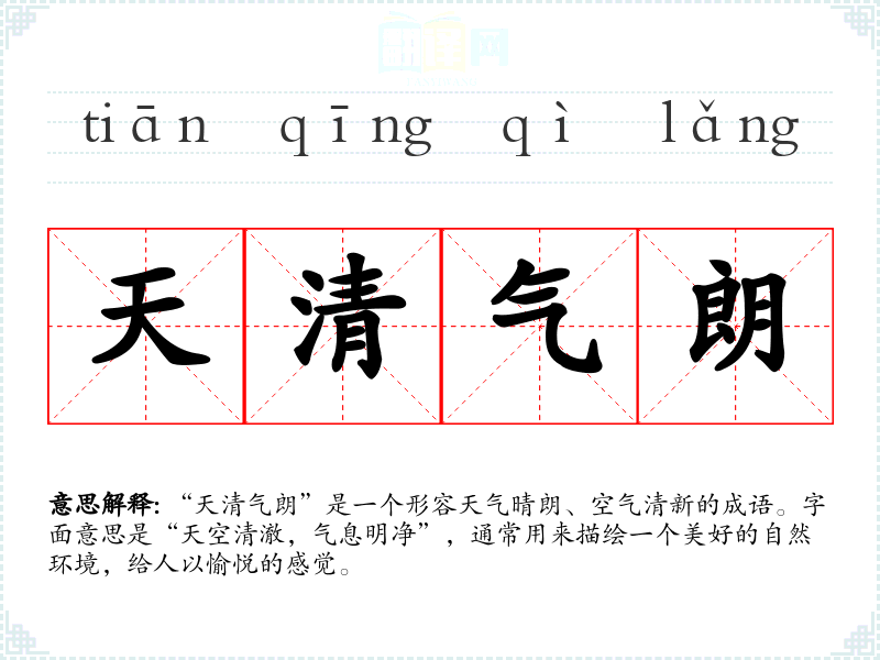 - 日常对话:可以用在谈论天气时,例如:“今天天清气朗,正适合去外面散步。”