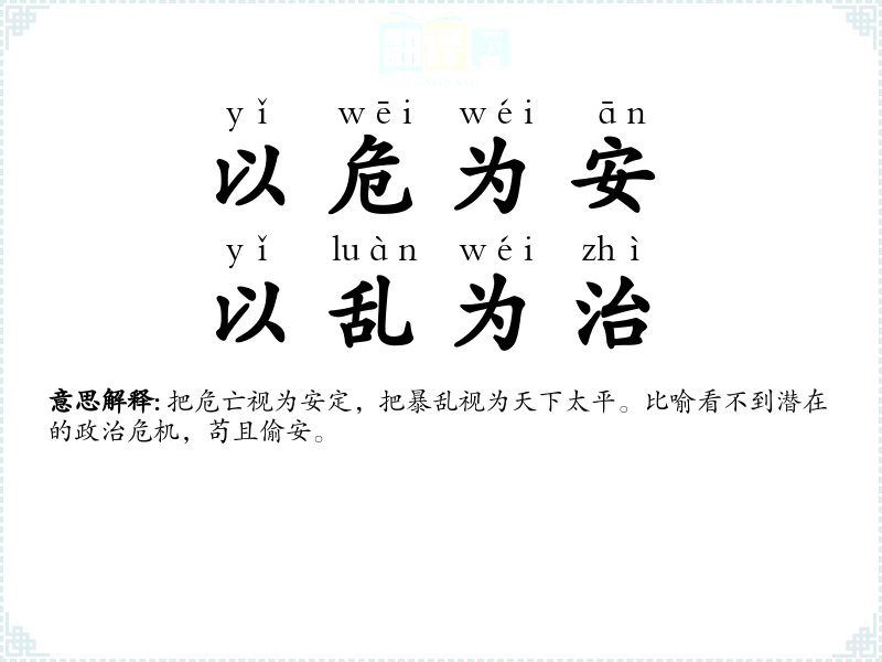 把危亡视为安定,把暴乱视为天下太平。比喻看不到潜在的政治危机,苟且偷安。 |