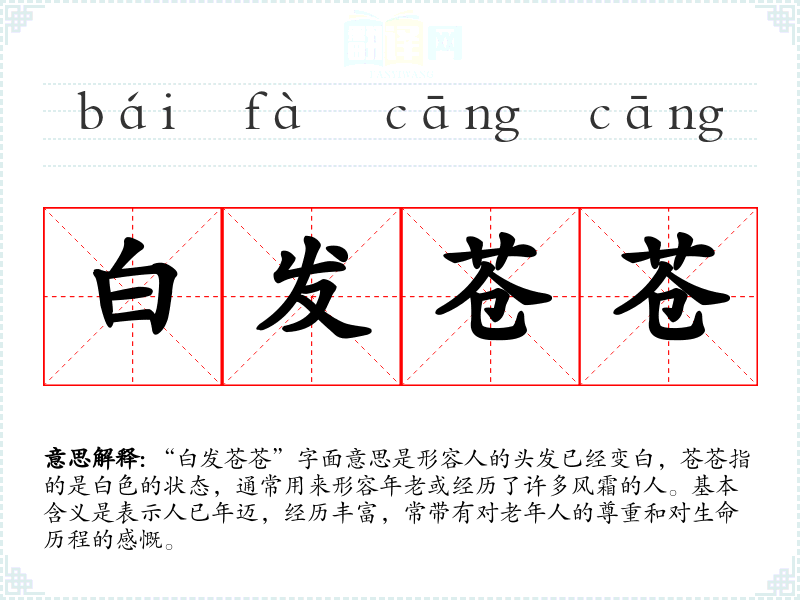 “白发苍苍”字面意思是形容人的头发已经变白,苍苍指的是白色的状态,通常用来形容年老或经历了许多风霜的人。基本含义是表示人已年迈,经历丰富,常带有对老年人的尊重和对生命历程的感慨。