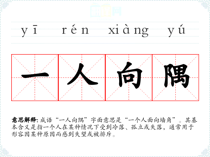 成语“一人向隅”字面意思是“一个人面向墙角”。其基本含义是指一个人在某种情况下受到冷落、孤立或失落,通常用于形容因某种原因而感到失望或被排斥。