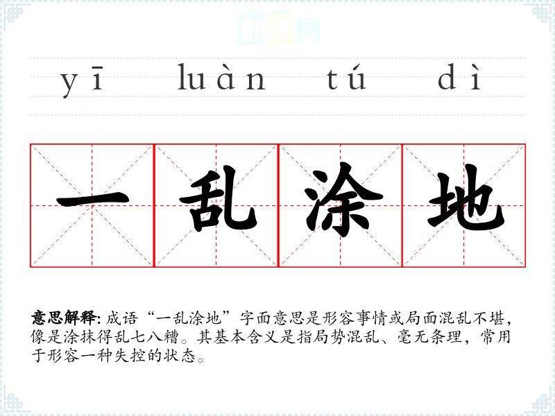 成语“一乱涂地”字面意思是形容事情或局面混乱不堪,像是涂抹得乱七八糟。其基本含义是指局势混乱、毫无条理,常用于形容一种失控的状态。