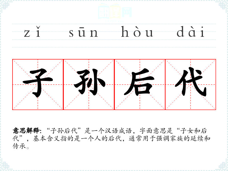 “子孙后代”是一个汉语成语,字面意思是“子女和后代”,基本含义指的是一个人的后代,通常用于强调家族的延续和传承。