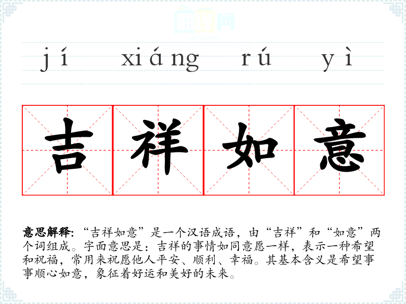 “吉祥如意”是一个汉语成语,由“吉祥”和“如意”两个词组成。字面意思是:吉祥的事情如同意愿一样,表示一种希望和祝福,常用来祝愿他人平安、顺利、幸福。其基本含义是希望事事顺心如意,象征着好运和美好的未来。