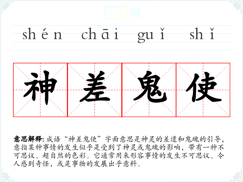 成语“神差鬼使”字面意思是神灵的差遣和鬼魂的引导,意指某种事情的发生似乎是受到了神灵或鬼魂的影响,带有一种不可思议、超自然的色彩。它通常用来形容事情的发生不可思议、令人感到奇怪,或是事物的发展出乎意料。