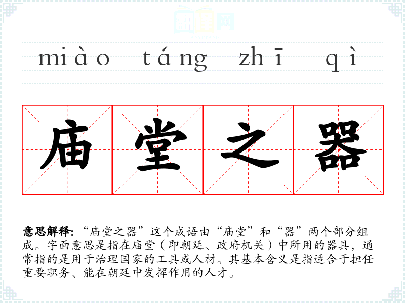 “庙堂之器”这个成语由“庙堂”和“器”两个部分组成。字面意思是指在庙堂(即朝廷、政府机关)中所用的器具,通常指的是用于治理国家的工具或人材。其基本含义是指适合于担任重要职务、能在朝廷中发挥作用的人才。