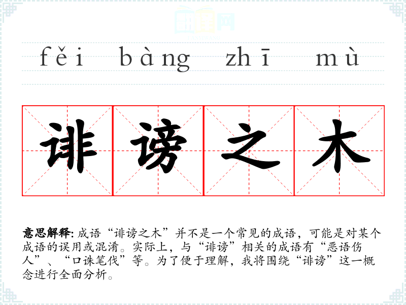 成语“诽谤之木”并不是一个常见的成语,可能是对某个成语的误用或混淆。实际上,与“诽谤”相关的成语有“恶语伤人”、“口诛笔伐”等。为了便于理解,我将围绕“诽谤”这一概念进行全面分析。