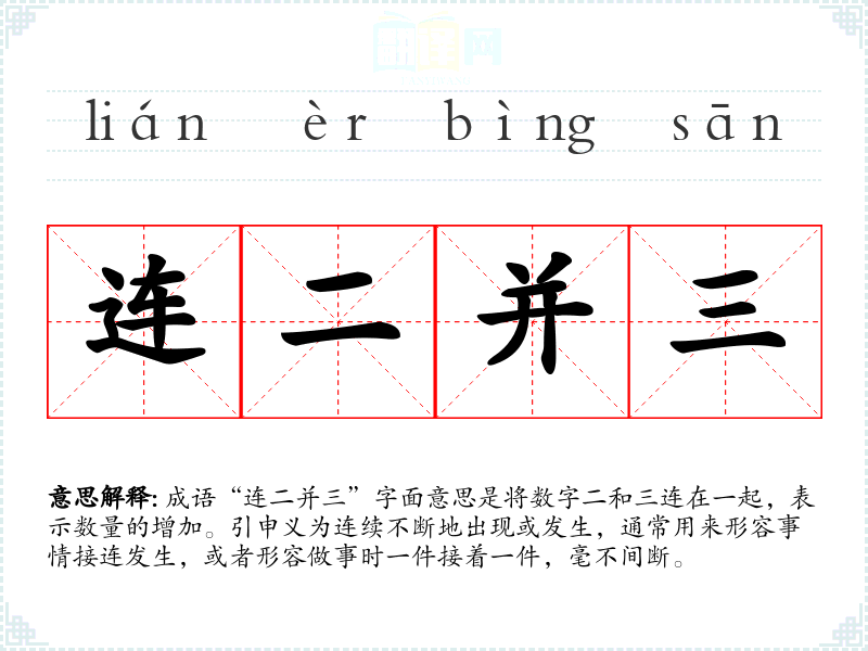 成语“连二并三”字面意思是将数字二和三连在一起,表示数量的增加。引申义为连续不断地出现或发生,通常用来形容事情接连发生,或者形容做事时一件接着一件,毫不间断。