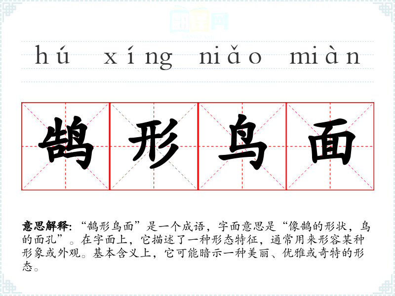 在**传统文化中,鸟类常与自由、灵动以及美丽联系在一起。鹄作为一种优雅的鸟,常被用作高洁品德的象征。因此,“鹄形鸟面”可以在特定文化背景中被理解为对优雅与品德的赞美。