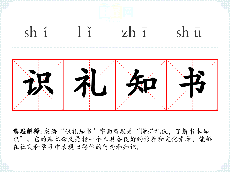 成语“识礼知书”字面意思是“懂得礼仪,了解书本知识”。它的基本含义是指一个人具备良好的修养和文化素养,能够在社交和学*中表现出得体的行为和知识。