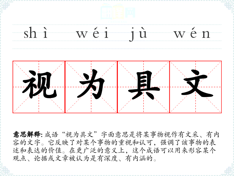 成语“视为具文”字面意思是将某事物视作有文采、有内容的文字。它反映了对某个事物的重视和认可,强调了该事物的表述和表达的价值。在更广泛的意义上,这个成语可以用来形容某个观点、论据或文章被认为是有深度、有内涵的。