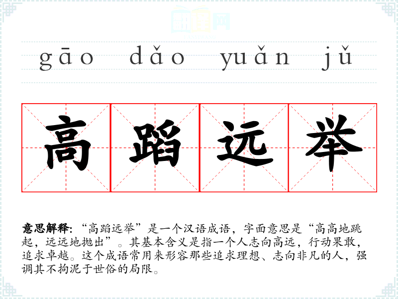 “高蹈远举”是一个汉语成语,字面意思是“高高地跳起,远远地抛出”。其基本含义是指一个人志向高远,行动果敢,追求卓越。这个成语常用来形容那些追求理想、志向非凡的人,强调其不拘泥于世俗的局限。