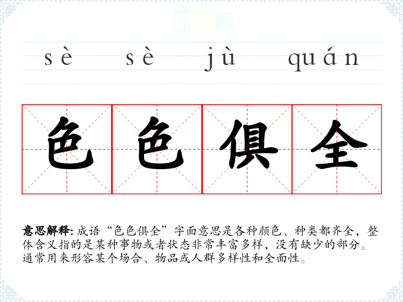 成语“色色俱全”字面意思是各种颜色、种类都齐全,整体含义指的是某种事物或者状态非常丰富多样,没有缺少的部分。通常用来形容某个场合、物品或人群多样性和全面性。