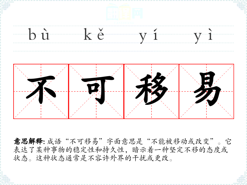 成语“不可移易”字面意思是“不能被移动或改变”。它表达了某种事物的稳定性和持久性,暗示着一种坚定不移的态度或状态。这种状态通常是不容许外界的干扰或更改。