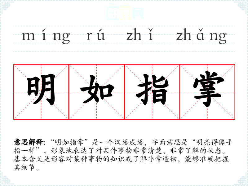 - 了如指掌:与“明如指掌”意思相似,表达对事物了解得很清晰。