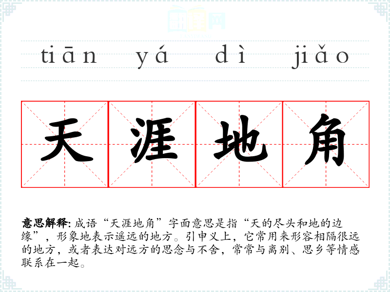 - 文学作品:在古典诗词中,常用来描绘离别之情。如李白的《静夜思》中,虽然没有直接出现“天涯地角”,但表达的情感与之相似。