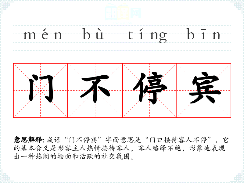 成语“门不停宾”字面意思是“门口接待客人不停”,它的基本含义是形容主人热情接待客人,客人络绎不绝,形象地表现出一种热闹的场面和活跃的社交氛围。