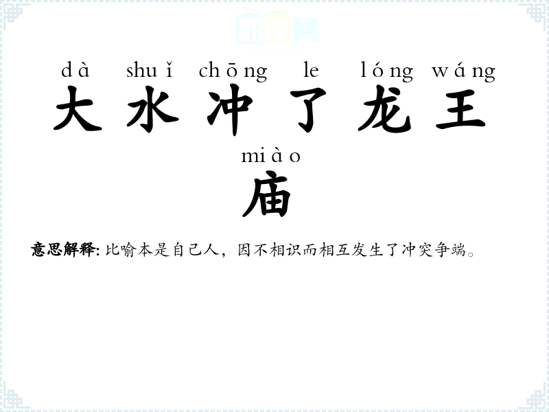 龙王庙:管水之神的庙宇。比喻本是自己人,因不相识而互相之间发生了争端。 |