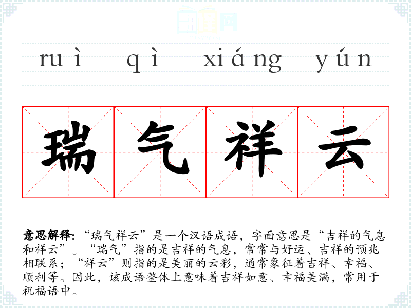 在英语中,类似于“瑞气祥云”的表达可以是“good fortune”或“blessing”。虽然这些表达也传递了吉祥和好运的含义,但在文化背景上,具体象征物的使用(如云、气)有所不同。不同文化对吉祥的象征可能各有侧重,但对美好生活的向往是共同的。