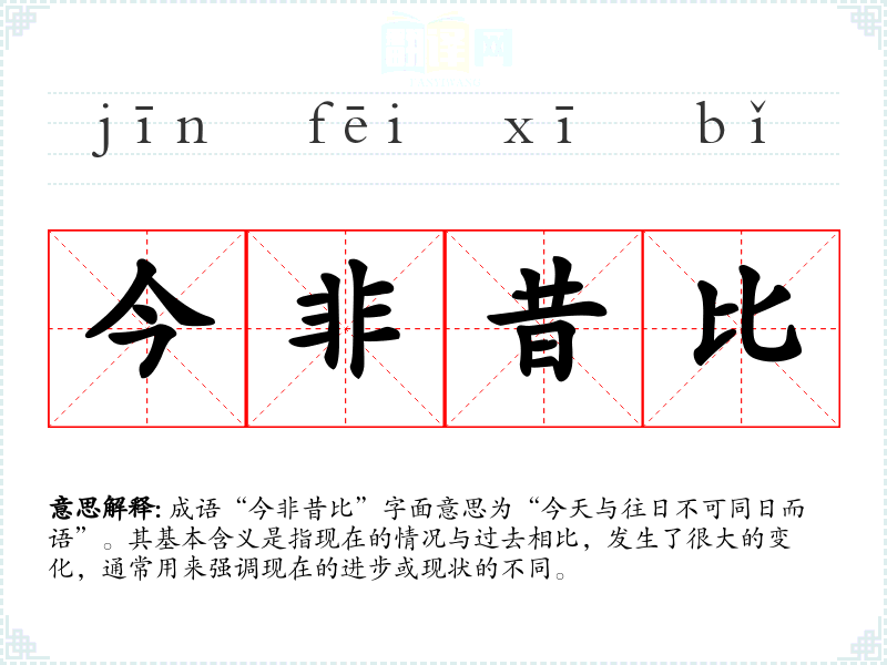 成语“今非昔比”字面意思为“今天与往日不可同日而语”。其基本含义是指现在的情况与过去相比,发生了很大的变化,通常用来强调现在的进步或现状的不同。