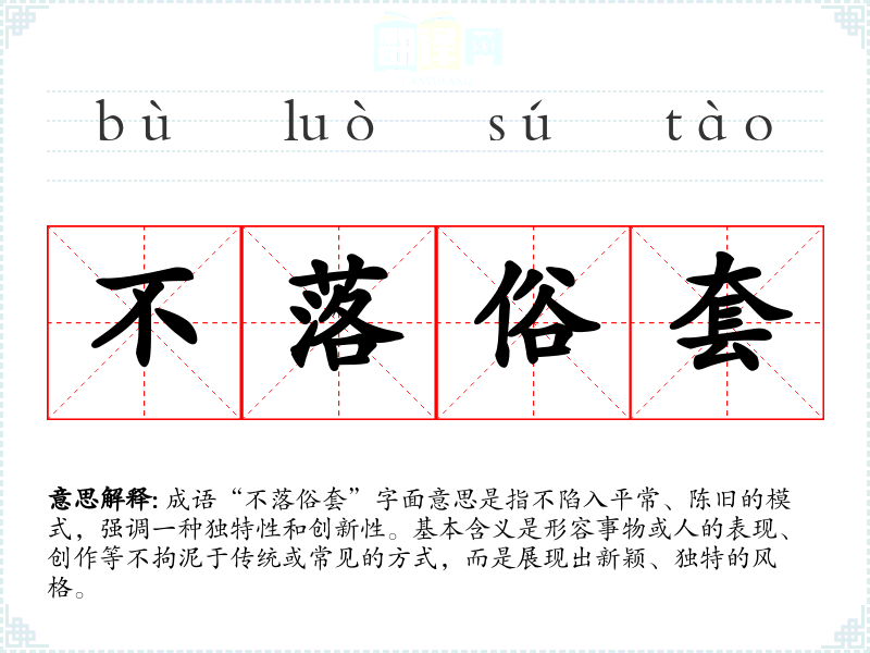 成语“不落俗套”字面意思是指不陷入平常、陈旧的模式,强调一种独特性和创新性。基本含义是形容事物或人的表现、创作等不拘泥于传统或常见的方式,而是展现出新颖、独特的风格。