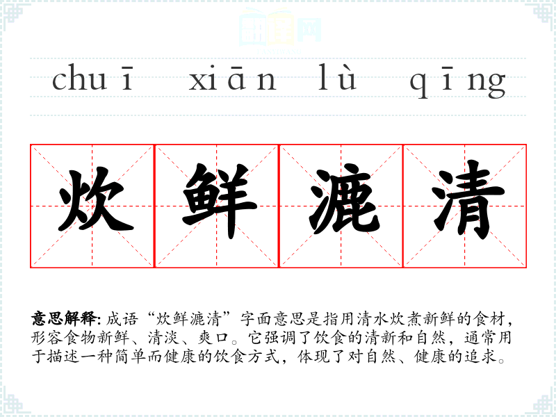 成语“炊鲜漉清”字面意思是指用清水炊煮新鲜的食材,形容食物新鲜、清淡、爽口。它强调了饮食的清新和自然,通常用于描述一种简单而健康的饮食方式,体现了对自然、健康的追求。